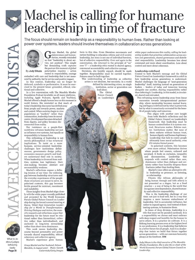 MRF CEO Judy Sikuza’s opinion piece in the Daily Maverick reflects on Graça Machel’s timely call for leadership that puts human dignity and responsibility first in a world torn by division and crisis. Judy aligns with Machel’s message that leaders must move beyond ego and power to serve people’s real needs, and she stresses that this shift is essential if we’re serious about healing societies and building resilient, empathetic leadership for Africa’s future.